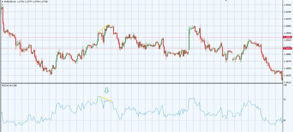 El RSI también puede funcionar eficientemente si nos fijamos en las divergencias. Es decir, cuando el precio muestra dos máximos crecientes o dos mínimos decrecientes, y el RSI se muestra la inversa. La particularidad de este modo de leer el indicador consiste en que a menudo nos proporciona más señales fases. Por lo tanto, conviene combinarlo con filtros chartistas: es decir, zonas de soporte y resistencia.