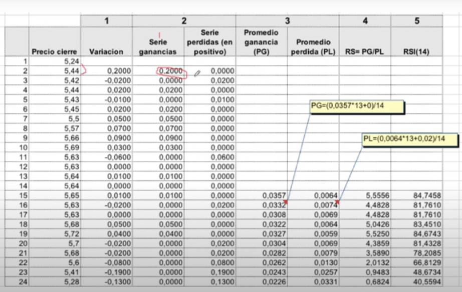 En esta fórmula la clave es el valor RS, que se calculad dividiendo ell promedio de ganancias por el promedio de pérdidas.