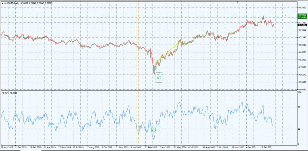 Si el RSI está por encima de 70, significa que el mercado está sobrecomprado y es probable que el precio retroceda. Después de una confirmación de la inversión, es decir, cuando la línea RSI comienza a caer, se podría colocar una posición de venta.